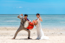 新婦様を抱き上げるその横で、小さなプリンセスがそっと見守る姿。家族のあたたかさが伝わる微笑ましい一枚です。
