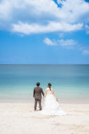 青いビーチを背景に見つめ合うふたりの表情がとても穏やかで、自然体の幸せがやさしく伝わる一枚です。