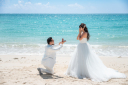 透き通る青いビーチで、風に揺れるベールと自然な笑顔。沖縄らしい開放感の中、おふたりの幸せな瞬間をやさしく切り取りました。