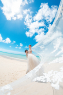 青いビーチでおでこを寄せ合うおふたり。風にふわっと広がるベールが包み込み、やさしくロマンチックな空気が流れる一瞬です。