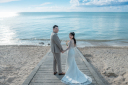 青いビーチで手をつなぎ、並んで見せる笑顔。自然な仕草と楽しげな表情が、おふたりらしい明るく幸せな時間を伝えます。
