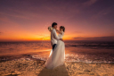ビーチを背景にバックハグをして新郎様がハートポーズ♡