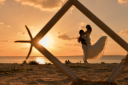 上から見る白い砂浜と青い海と空に新郎新婦様♡ドローンでしか撮影出来ないお写真も素敵な想い出となりますよね♪