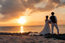 直射日光の強い夏の暑いビーチで麦わら帽子を被り新郎様へニコニコ可愛く微笑む新婦様♡
