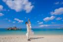 お次は、うっぱまビーチへ。エメラルドグリーンの海と白い砂浜の背景がお二人にマッチしています。