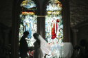 結婚式では、チャペルで過ごす時間はウェディングドレスを着ています。カラードレスでのチャペル撮影はフォトウェディングならではですね♪