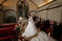 先ほどは、ステンドグラスを後ろに撮影しましたが、入り口側に移動し、自然光が入る場所で撮影。そのため、チャペル内が影のようになり、お写真にメリハリが出ます!