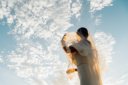 天気が良すぎて 空が青でした新婦様をシルエットにして撮影
