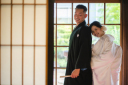 お庭の見える縁側に腰掛けられた新郎様と廊下を歩く新婦様の雰囲気のあるワンショット!