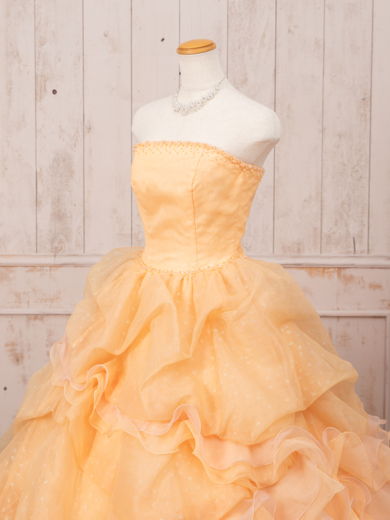 ボリュームあるオレンジのドレス。キラキラとラメが輝く華やかな1着。