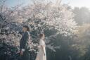 桜からのお2人の左手と笑顔がとっても映える1枚。桜の優しいピンクが暖かみと朗らかな印象を与えてくれていますね♡
