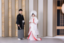 タペストリーの背景で撮影スタート!腕組みのポーズでおふたり仲良し♥