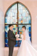 タキシードとカラードレスに合う背景とブーケでおしゃれに