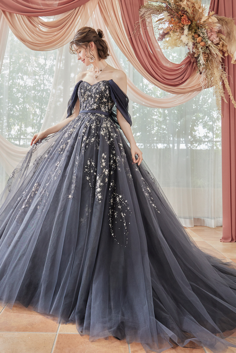 異なるカラーのチュールを重ねたニュアンスカラーが魅力。星柄のグリッターチュールが流れ星のように煌めくLulu feliceらしい一着。