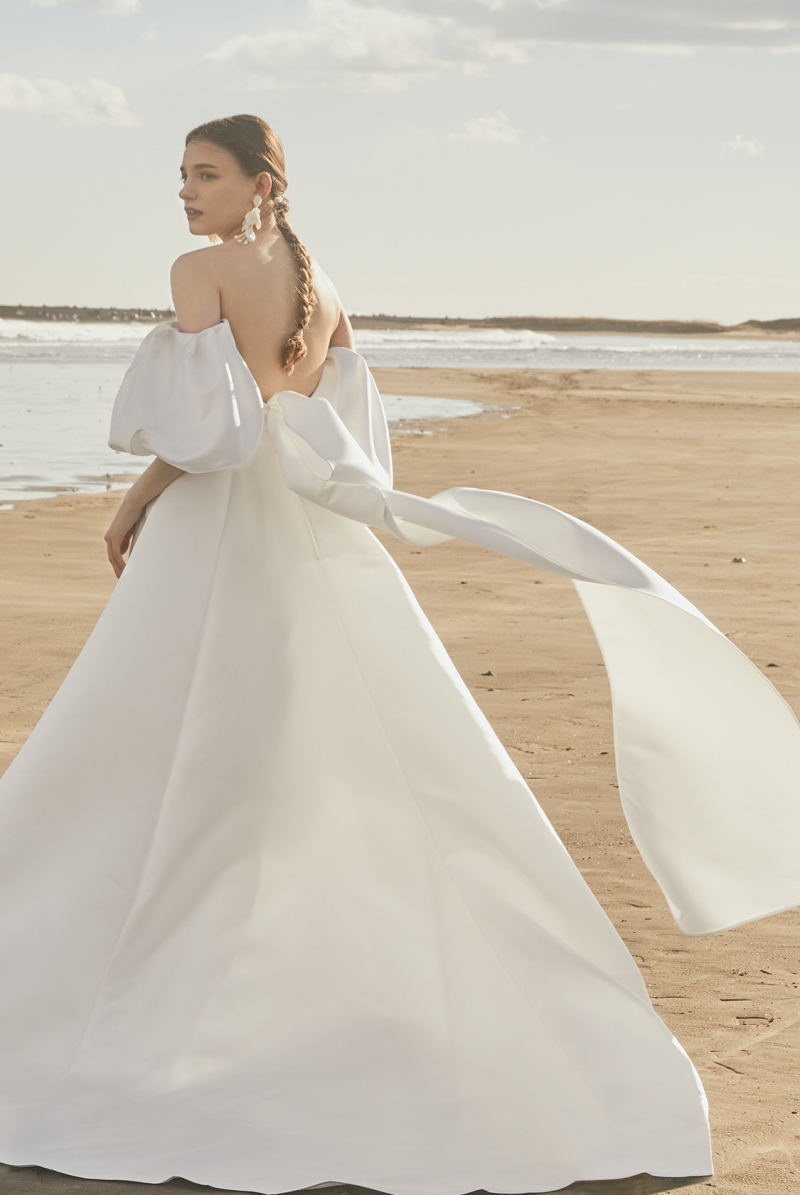 上品な光沢をもつヘビーサテンを使用し、ビックパフのオフショルダーや身頃の造形的なドレープがモダンな印象。ノーギャザー、ノータックのシンプルなスカートはけまわしをたっぷり取り、ウエスト周りをスリムに魅せてくれるこだわりのシルエットです。