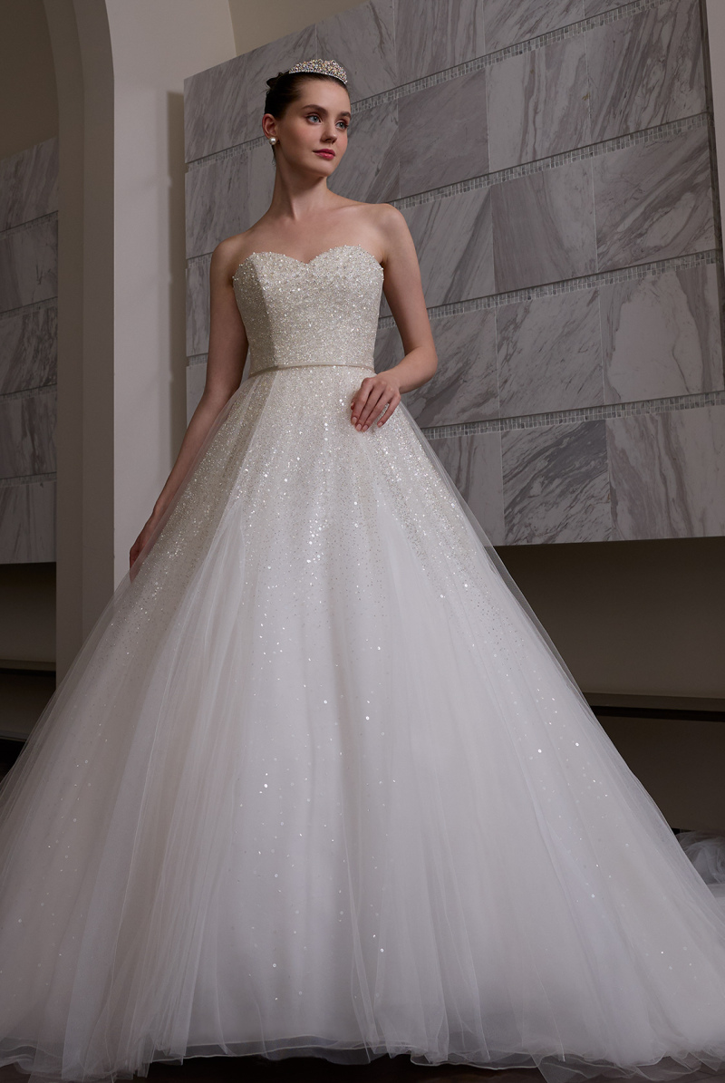 シルバービジューとスパンコールが互いに反射し合いキラキラと輝き続けるリュクス感溢れるウエディング。チュールの量感と光のコントラストが堪らなく美しい一着。シースルーのブラウスは取り外し可能でビスチェドレスとしてもお召しいただけます。