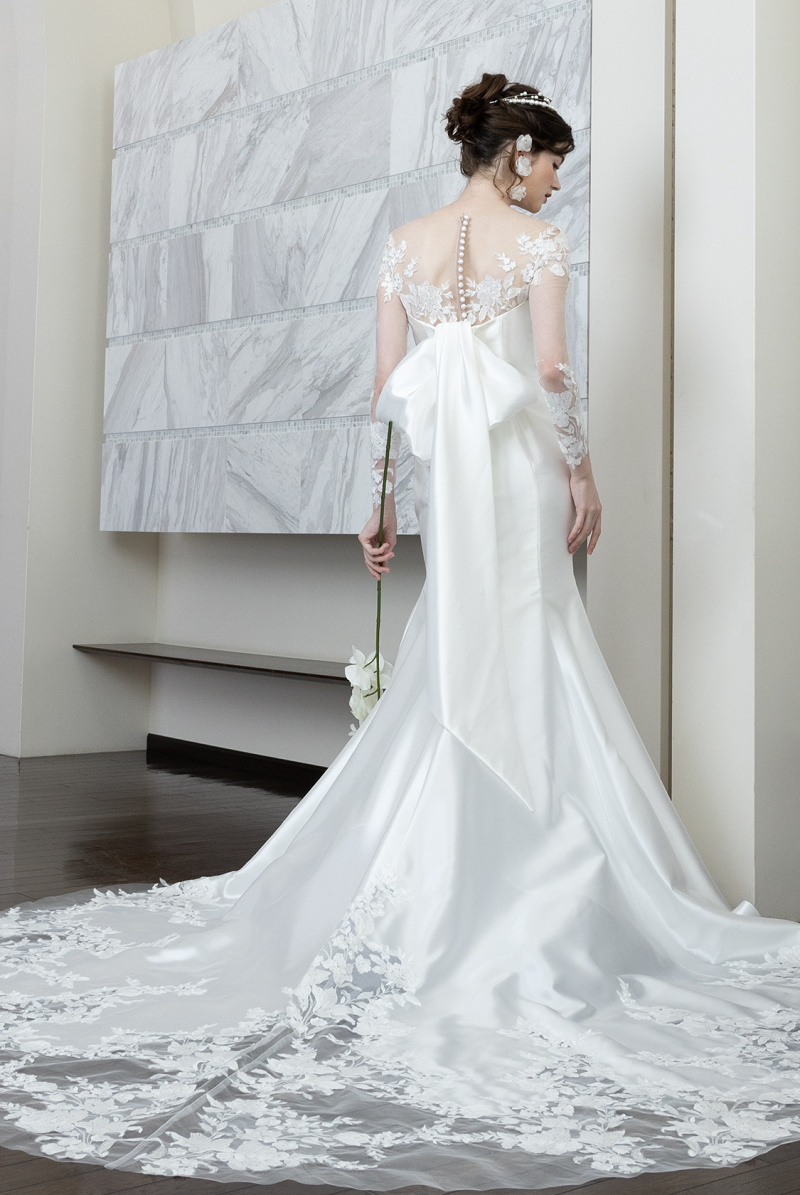 しなやかなツイルの光沢感、その上質なドレープ性が生かされたカシュクールケープマーメイドウェディング。デコルテを優しく纏うそのフェミニンなフォルムから、繊細なレースが覗く様が可憐で美しい一着。