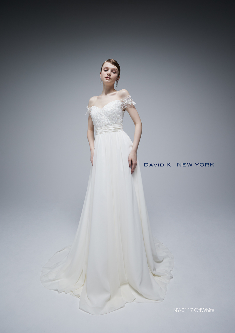 【DAVID K NEW YORK(デイビッドケイニューヨーク)】NYテイストからインスパイアされたウエディングコレクション。身頃からオフショルダーにかけてレースを施しました。シンプルながらにも華やかに着こなしていただけます。