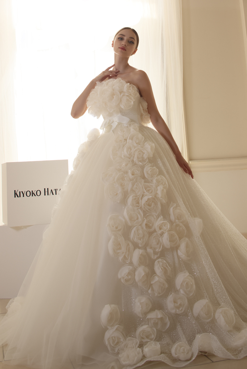 胸元とスカートに咲き誇る薔薇をウエストのリボンでブーケの様にまとめ前開きのスカートの様にあしらった薔薇がスタイルアップ効果を叶える。