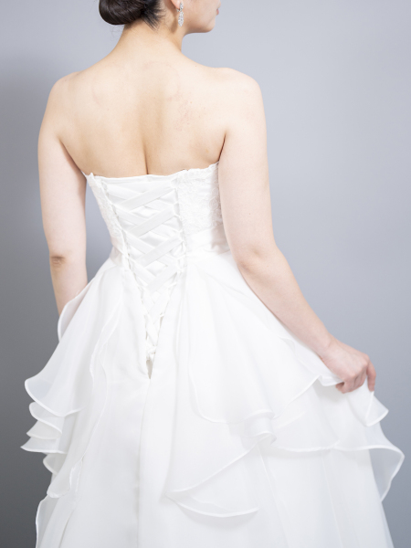 ティアード風のスカートが軽やかで華やかな印象を与えるAラインドレス。ストレートラインのビスチェが胸元をすっきりと見せ、上品でスタイルアップ効果も抜群。動くたびに揺れるシルエットが、美しさをより一層引き立てます。