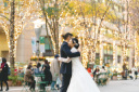 東京駅のライトアップを背景に、おふたり並んで・・ウェディングドレスに赤いブーケが映えます。