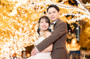 街灯に柔らかなライトが灯り始め撮影の雰囲気が一段とロマンチックに!お二人の穏やかな表情が、その優しい光に照らされてより引き立っていますね。