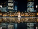 撮影がスタート。黄昏に染まる空の下ゆったりと流れる時間がふたりを優しく包み込んでいますね。噴水のきらめきと夕暮れのグラデーションが重なり幻想的な雰囲気に。