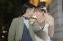 東京駅舎をバックに、お二人の姿がキラキラと輝いて見えます 歴史ある建物と華やかな光のコントラストが、一生に一度の特別な瞬間をより魅力的に演出していますね。