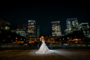 街灯の優しい光に包まれて寄り添うお二人がまるで映画のワンカットのよう。夜景に浮かび上がるドレスのシルエットと東京駅舎のライトアップが素敵ですね♡