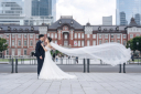 木漏れ日の森の中でロングベールがふたりを優しく包み込み、とても幻想的ですね。光に透けるベールの広がりがロマンチックで、結婚写真ならではの特別な瞬間ですよね。
