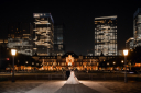 広い空の下で手を伸ばすふたりの後ろ姿がとても爽やかですね。青空と水辺の景色に包まれて、開放感いっぱいの結婚写真になっていて素敵ですよね。
