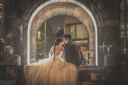 肩を寄せ合うふたりの距離がとても自然で、柔らかな光が赤い和装を包み込みますね。背中越しに伝わる穏やかな気配と、そっと見つめ合う瞬間が温かい記憶として残りますね。