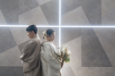 都会の街並みの中、横断歩道を歩くふたりの姿が自然で素敵ですね。白いドレスのラインが風に揺れてビルの谷間に広がる空と溶け合い、日常が特別に変わる瞬間を感じますね。