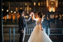 寄り添って見つめ合う新郎様と新婦様が、そっと手を重ねた瞬間に穏やかな空気が流れます。背景のライン光がシルエットを引き立て、静かな大人の雰囲気がより印象的ですね。