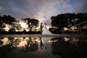 振り返って微笑む新郎様と新婦様が、腕を寄せ合い自然な距離感を見せます。水辺に映る緑の景色が、和装姿のお二人をやわらかく包み込んでいますね。
