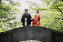 並んで立ち、和傘を手に穏やかに微笑む新郎様と新婦様の佇まい。庭の緑に包まれた小径がやさしく彩り、静かな和の空気と自然な距離感が心に残る印象もありますね。