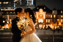 そっと額を寄せ合い、静かに手を重ねる仕草が凛とした空気を生み出します。新郎様新婦様を包む光とドレスの立体感が、洗練された一枚に導いてくれますね。