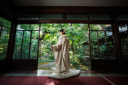木陰に腰掛けてブーケを抱え、やさしくこちらを見つめる姿が印象的な一枚。自然光に包まれた中で、新婦様のそっとした柔らかな表情と静かな佇まいが心に残りますね。