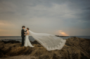 夕日に染まる海を背に、額を寄せ合うお二人のシルエットが浮かび上がっています。オレンジ色の空とベールが重なり合う、特別な瞬間が残せましたよね。