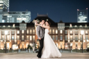 【 撮影スポット2 】丸の内ブリックスクエアにて。ベージュのカジュアルなタキシード、袖有りドレスの組み合わせは、お昼間の撮影で最適☆