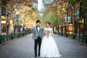ヨーロッパの街並み様な背景で、お二人寄り添うショットを撮影し、本日の撮影は終了とさせて頂きました!タクシーでドレスショップへ戻り、お着替えをして帰宅となります