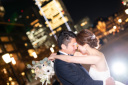 ご新婦様がお選びいただいた赤いカラードレスが夜の東京駅に映える1枚です。