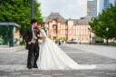ライトアップされた東京駅を背景に背中合わせのお二人。腕を組んだり目線を合わせるだけじゃなくあえてお二人とも目線を外していきます