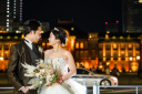 手繋ぎで素敵な笑顔のお二人。東京駅の花束に見立てライトアップされた樹々が優しくお二人を照らします♡