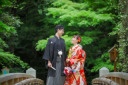 六華苑の庭園内には、池・紅葉・お茶室など和装撮影との相性が良い様々な撮影スポットがあります。こちらの写真は庭園内の奥側の歩道から、撮影を行なった写真となります。