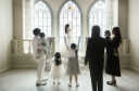 階段に立ち、手を取り合って遠くを見つめる姿が…♪純白のベールがふわりと舞って、幻想的な時間の始まりを告げます。