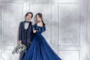 ふんわり広がるブルーグレーのドレスと、クラシカルなスーツの組み合わせが花の色をより引き立てていて、まるで映画のワンシーンのようでした。
