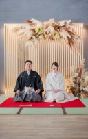 華やかな色打掛と落ち着いた和装姿。和の装飾に囲まれた空間で、おふたりの穏やかな表情が印象的な一枚です。