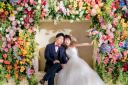 たくさんのカラフルなお花が咲くフラワーウォールの前でシンデレラショットを