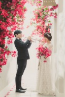 お二人が顔を見合わせると自然な表情が撮影できます。花を前に持ってくると綺麗に仕上がります。